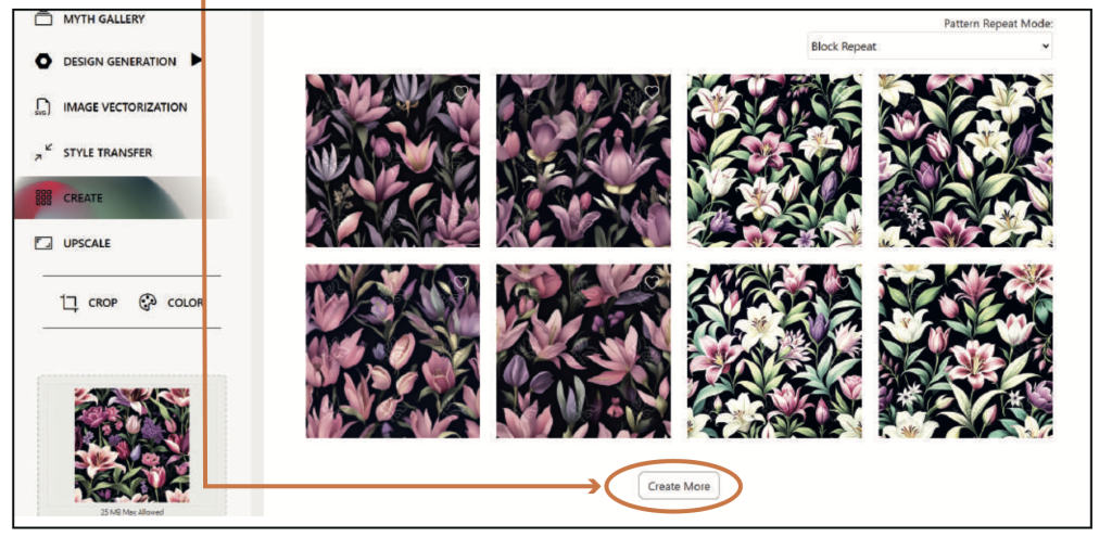 - Generate Variations: MYTH AI’s generative feature enables you to create multiple variations of your pattern with a single click. This feature is particularly useful for experimenting with different looks and selecting the best one.