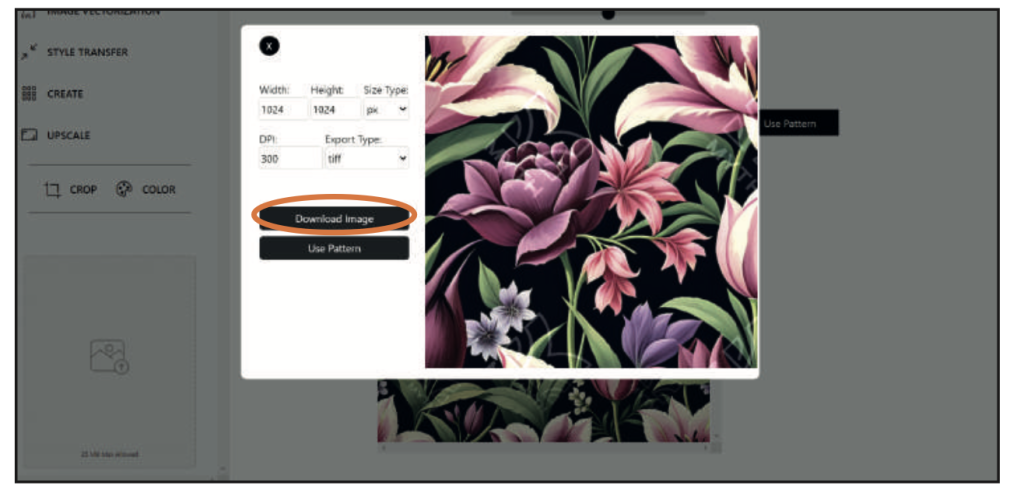 - Export Options: MYTH AI offers various export options, allowing you to save your pattern in different formats such as JPEG, PNG,PDF, TIFF or SVG. Choose the format that best suits your intended use.